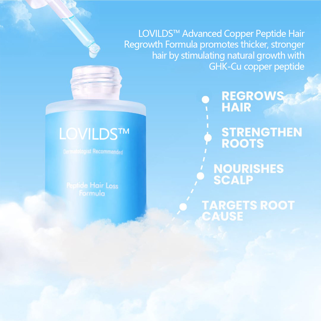 Hair loss often begins when your follicles go dormant, unable to produce thick, healthy strands. The main ingredient, Copper Peptides, inLOVILDS™work at the cellular level to reactivate these dormant follicles, promoting new, natural growth and restoring hair density.